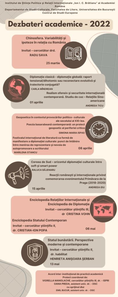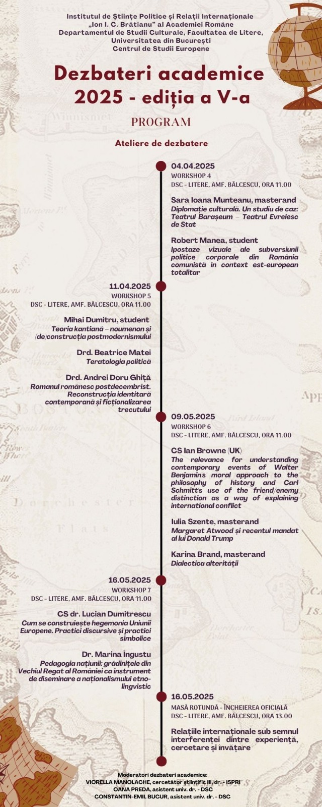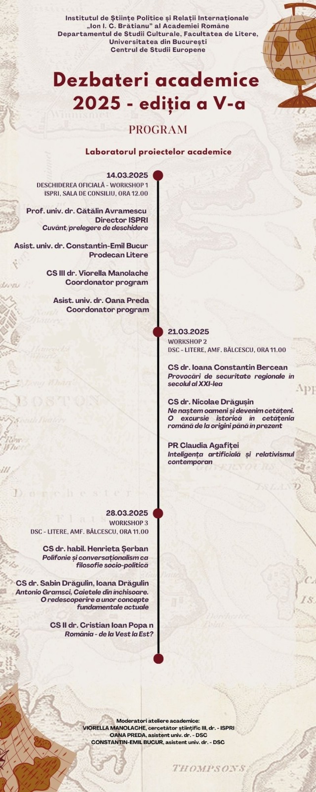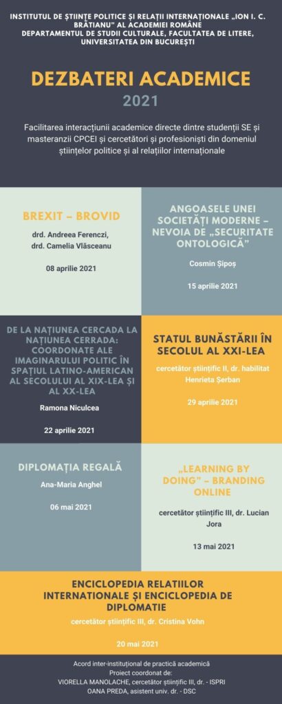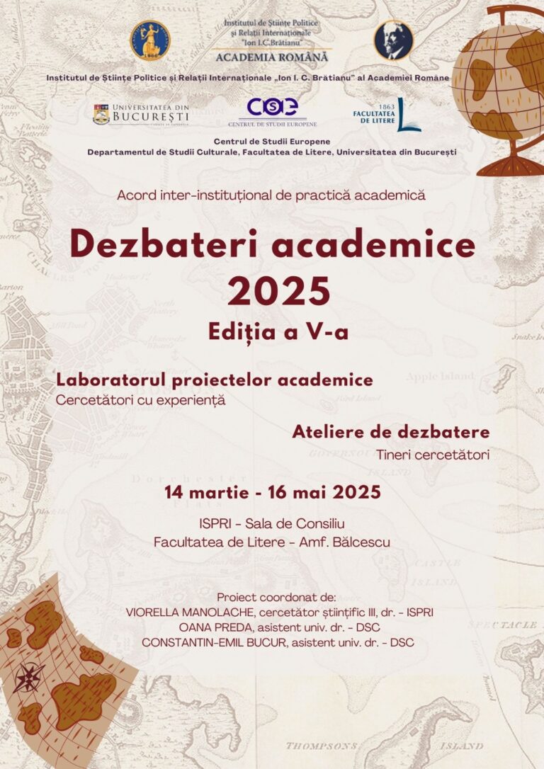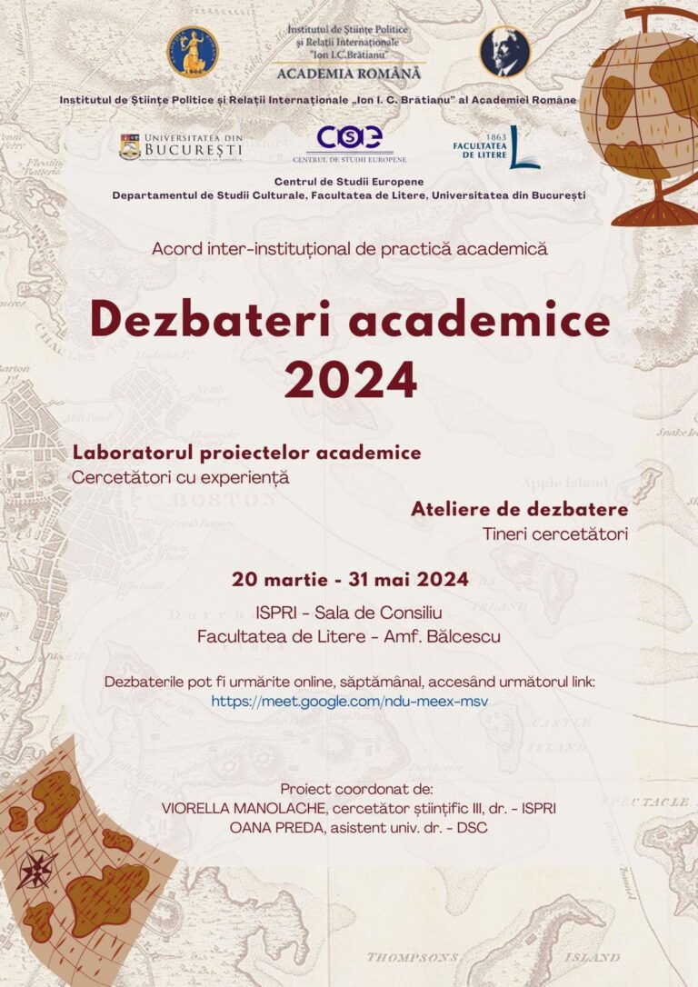 Dezbaterile academice anuale organizate de Institutul de Științe Politice și Relații Internaționale „Ion I. C. Brătianu” al Academiei Române, în colaborare cu Departamentul de Științe Politice, Centrul de Studii Europene și Departamentul de Studii Culturale al Facultății de Litere, reprezintă un forum dedicat schimbului de idei și discuțiilor aprofundate pe teme de actualitate din domeniile științelor politice, relațiilor internaționale, studiilor europene și culturale. Aceste evenimente anuale aduc împreună academicieni, cercetători, experți și studenți din diverse domenii, oferind o platformă excelentă pentru dialog, colaborare interdisciplinară și diseminarea cunoașterii. Prin prezentări de lucrări, sesiuni de discuții și ateliere tematice, participanții au oportunitatea de a explora și de a dezbate provocările contemporane, contribuind astfel la dezvoltarea teoriilor și practicilor în domeniile respective.
